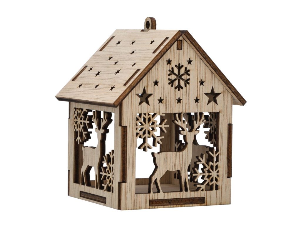 Jemně vyřezávaný vánoční domeček z přírodního dřeva, ideální pro umělé LED čajové svíčky nebo drobná světýlka. Otevřené motivy nechají světlo krásně prosvítat a vytvářet útulnou zimní atmosféru. Rozměr 10,5 × 7 × 7 cm.